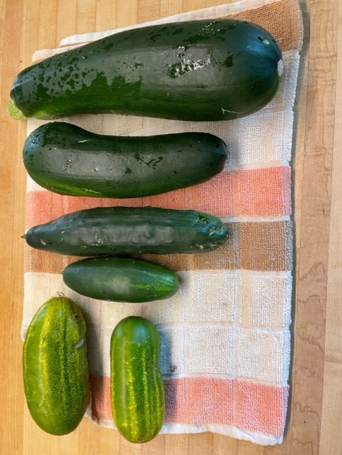 From Top–Black Magic Zukes, and Wautoma Heirloom and WESconsin SMR 58 (AKA Mini-Watermelon) Cukes, destined for (respectively) Zuke Fritters, the lovely and long suffering Mrs Gotch’s Cuke/Olive/Red Onion/Chickpea Salad, and Quickles