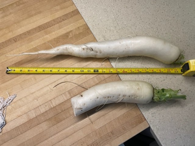 Monster April Cross Daikon Hybrid (direct seeded ~April 7th) two (2) feet/.61 meters, it’s truncated pal (whose severed portion was subsequently rescued) would’ve been bigger. Shredded Daikon in Spud/Mac/Cole Slaw salads in the On Deck Circle!