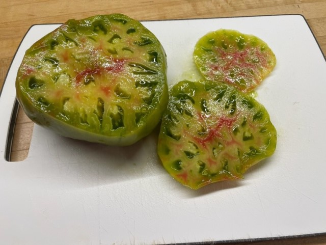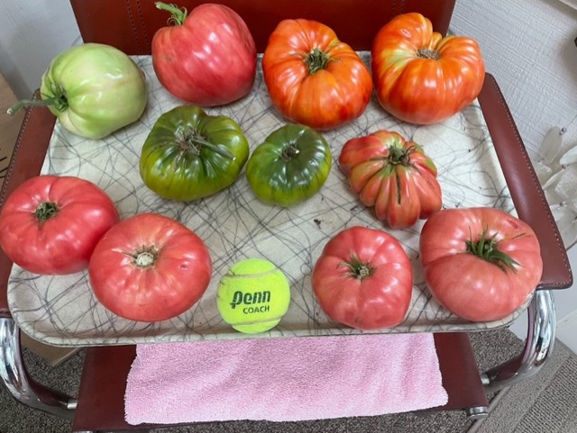 Clockwise from top left: two Pink Gift, two Guido, one Zapotec Oaxacan, two Pink Magic, Penn “Coach” Tennis Ball, two Radiator Charlie Mortgage Lifters, two green when ripe tricolor Ananas Noire holding down the middle, the bigger one to be…um…conscripted for today’s Monday Morning BLT Brunch
