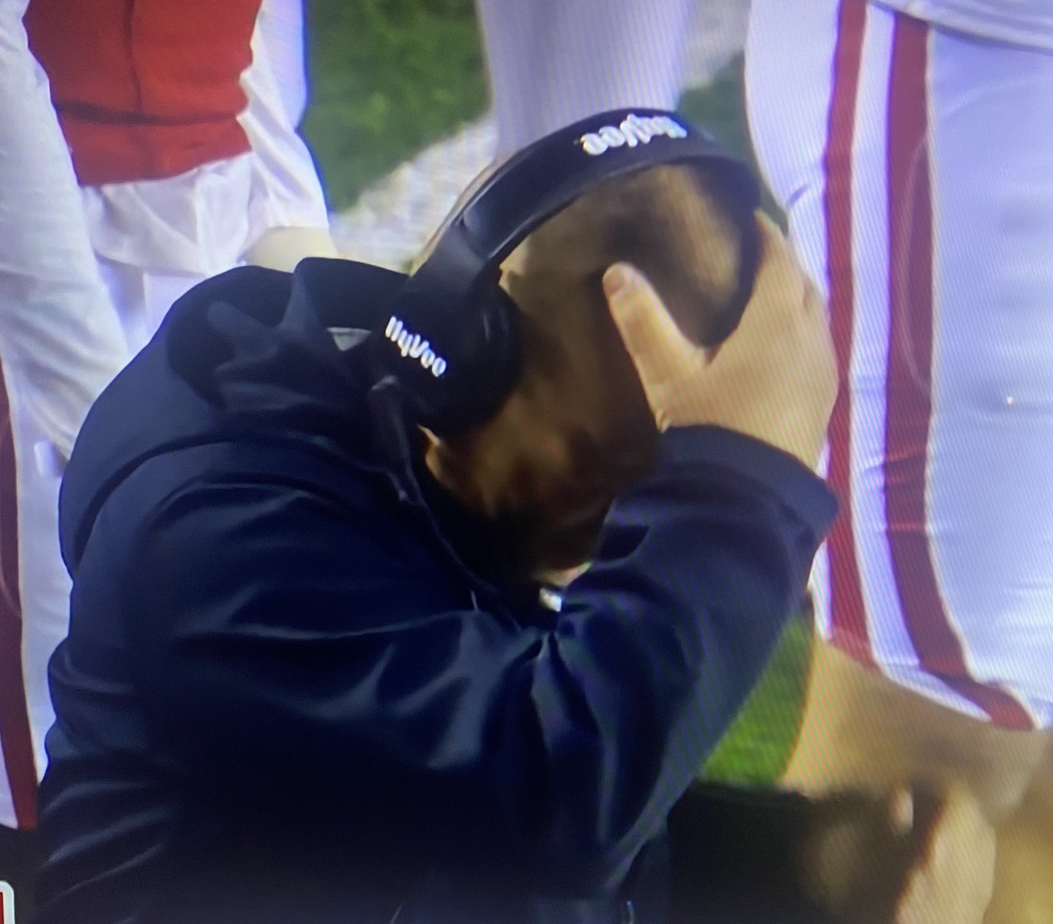 There is Coach Fickell on the sidelines watching the ball hit the receiver in a bad place — the hands — thrown well short of the line to gain. Surrounding the coach are 72,000 fans fighting the urge to throw their own projectiles, shout their own instructions in basic anglo-saxon, and go off-sides themselves.