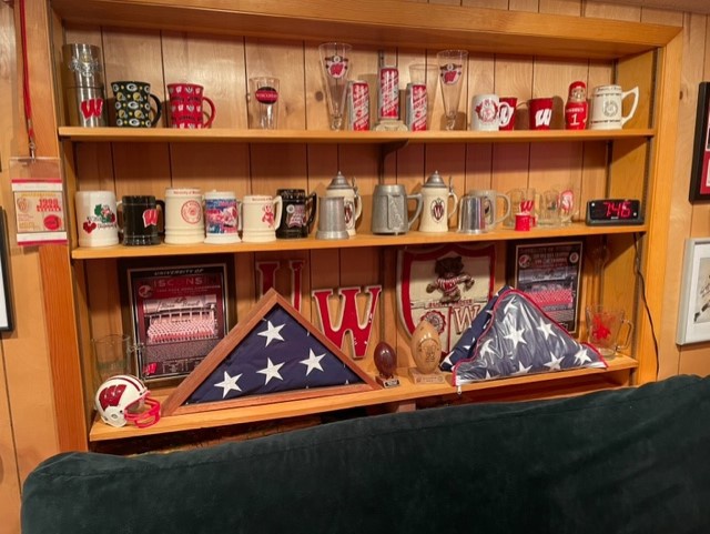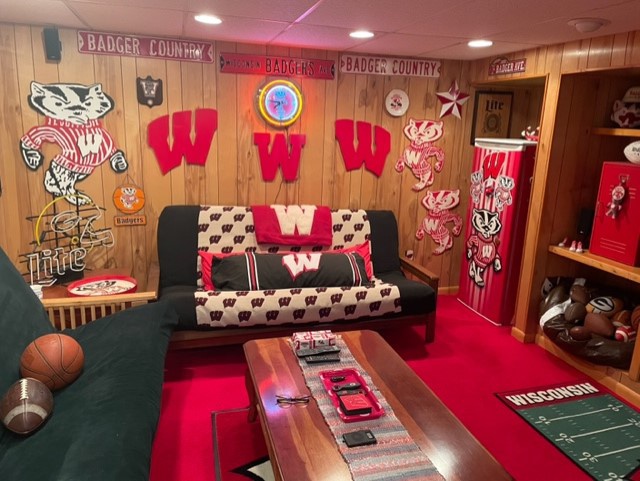The Gotch’s Cardinal-n-White certified RED ROOM©™® will be rockin’ today….Lucky Football and Lucky Basketball on the left, Bucky Beer Fridge (packed to the gills!) on the right.